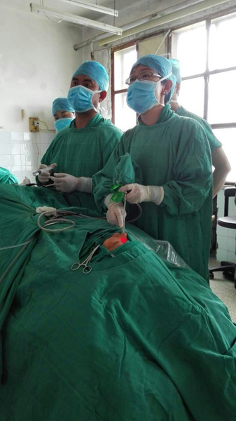 图为我院杨丽红医生成功实施手术后在当地手术室留影