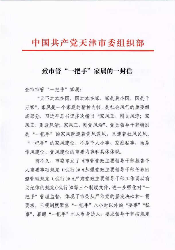 通过家访与领导干部及家属面对面沟通,拉家常、访家情、察家风,既有效地宣传市委要求,确保制度落实,又进一步拉近了干部与组织的距离。下一步,市委组织部将按照市委要求,采取更加切实有效的措施,大力加强对领导干部特别是“一把手”的管理监督,持续用力,久久为功,为建设高素质干部队伍做出贡献。 来源:官微-天津12380