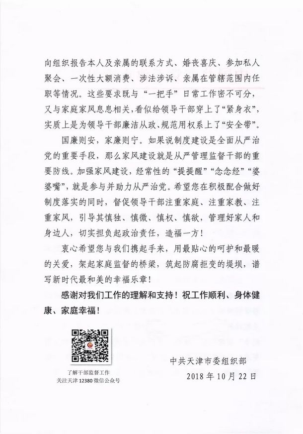 为确保制度落地见效,市委组织部采取事先不打招呼的方式,连续一周每天19:30至21:00对79名市管“一把手”进行家访,核实家庭实际居住地址、配偶子女联系方式等信息报告的真实性,向家属发送《三项制度宣传册》《市委组织部致市管“一把手”家属的一封信》以及印有“天津12380”微信公众号标识的宣传品,面对面宣传三项制度,着力提高领导干部及家属了解规定、落实规定,接受监督、参与监督的主动性和积极性。