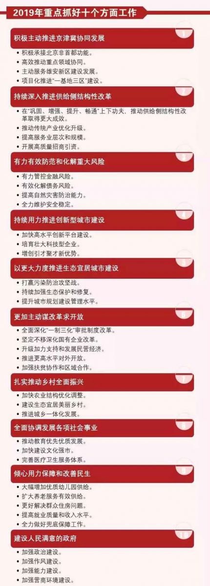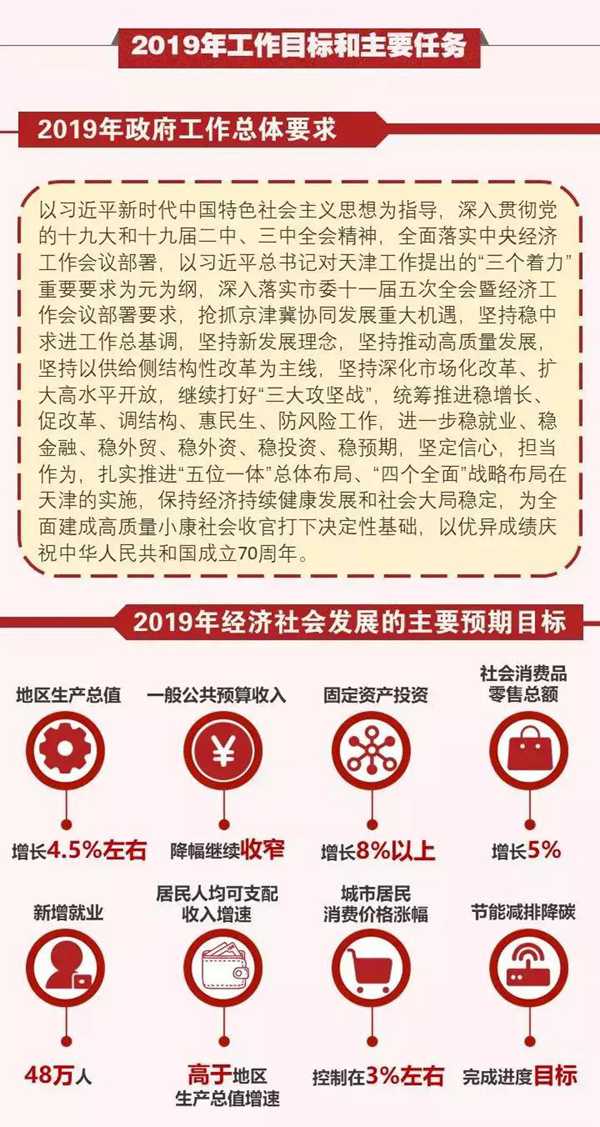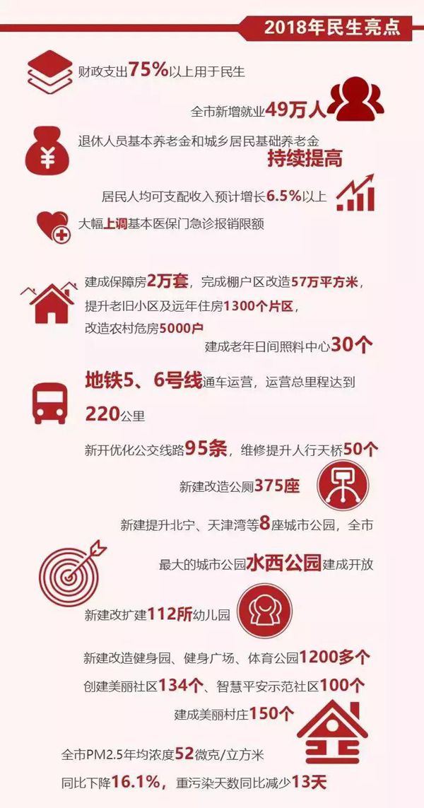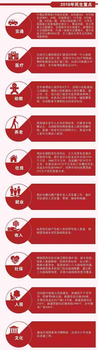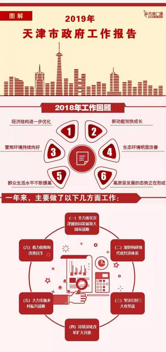 报告指出,过去一年,是天津发展历程中不平凡的一年。在这一年中,天津交出了怎样的成绩单,又将如何设定2019年的奋斗目标和工作任务?住房、教育、医疗、就业、养老、社保……政府在新的一年将作出哪些民生承诺?天津广播用图解方式梳理出本次报告的要点: