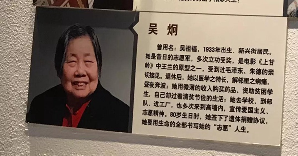 在社区志愿服务展馆中展出的画像。刻画了上世纪八十年代,最初开展志愿服务的13名志愿者。现在,他们都已离世。(央视记者王哈男拍摄)