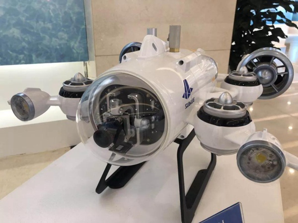 水下观测机器人,最深下潜深度可达100米。可在水下观测、寻找、协助打捞、搭载其他设备完成各类任务。通过VR头盔可以更沉浸式地观测水下情况。(央视记者王哈男拍摄)
