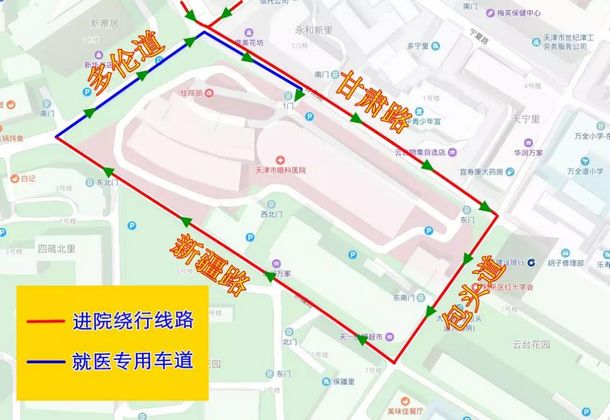 据了解,就医专用车道设置于每日7时30分至10时30分就医高峰时段,专用车道设置方向为甘肃路至多伦道延伸路段,使用锥桶区分就医排队车道和正常通行道路,便于就医车辆驾驶人辨认。就医车辆可从甘肃路右转包头道再右转驶入新疆路,从新疆路与多伦道交口右转直接驶入就医专用车道。多伦道是自东向西方向单行路,而就医专用车道内的行车方向刚好与单行路相反。