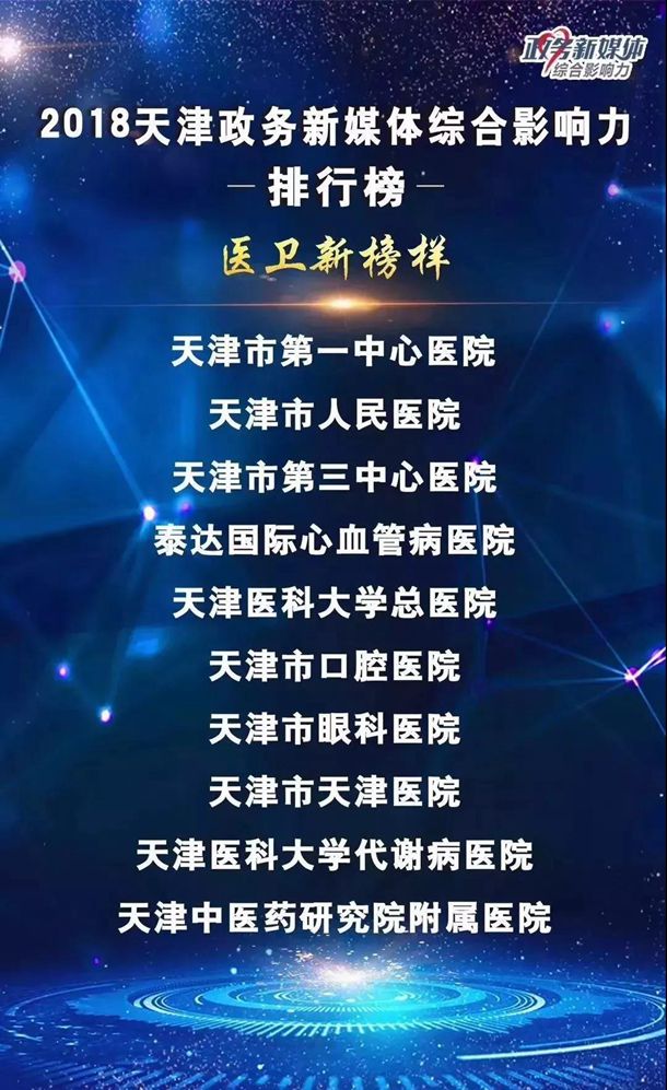 天津市眼科医院入选“2018天津政务新媒体综合影响力排行榜TOP10”,荣获“医卫新榜样”荣誉称号。