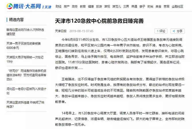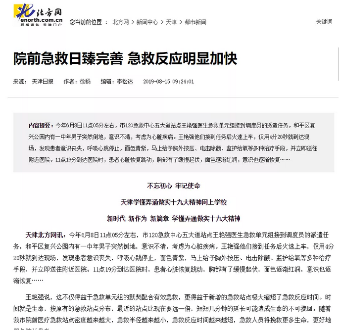 今年6月8日11点05分左右,市120急救中心五大道站点王艳强医生急救单元组接到调度员的派遣任务,和平区复兴公园内有一中年男子突然倒地,意识不清,考虑为心脏疾病。王艳强他们接到任务后火速上车,仅用4分20秒就到达现场,发现患者意识丧失,呼吸心跳停止,面色青紫,马上给予胸外按压、电击除颤、监护给氧等多种治疗手段,并立即送往附近医院。11点19分到达医院时,患者心脏恢复跳动,胸部有了缓慢起伏,面色逐渐红润,意识也逐渐恢复……
