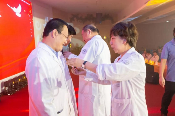 活动现场,医院各时期的领导代表,为在医院工作40余年,至今仍然辛勤奋战在临床一线的老专家们佩戴院徽;老一辈专家又为新一代各专业学科带头人、天津市津门医学英才、天津市青年医学新锐佩戴院徽;新一代专业学科负责人还为2019年新员工佩戴了院徽。