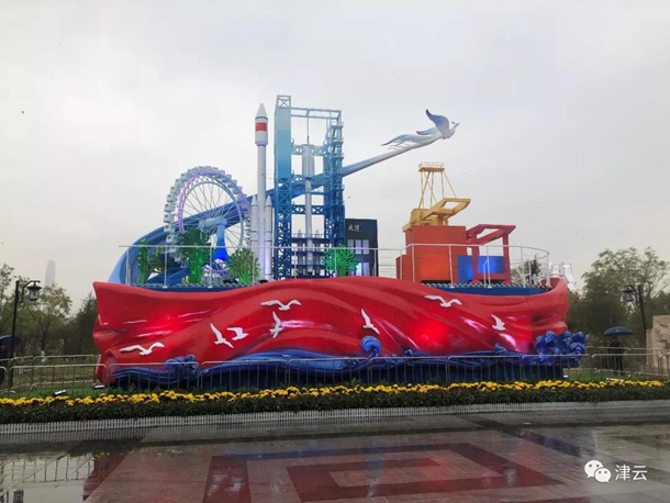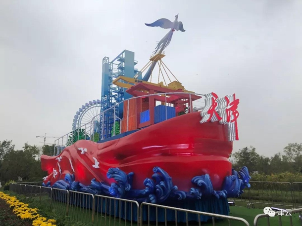 红色的天津港龙门吊、蓝色的浪花、白色的天津之眼摩天轮、绿色的生态之树……什么?你说色彩有点多?不不不,看起来非常舒服,特别是梁臂,浪花等细节部分,采用了渐变色的设计,显得非常灵动。当然,记者也不是很懂美术,对于“色号”也说不出什么道理来,总之,天津彩车给人的感觉就是“清爽”。