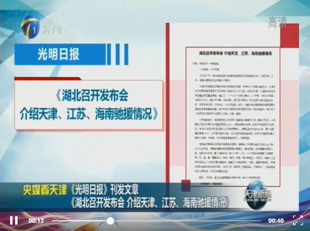 《光明日报》刊发文章《湖北召开发布会 介绍天津、江苏、海南驰援情况》,文章说,天津医疗队在救治方面,推出“前后方联动,及时会诊,24小时连线”;“引入微医互联网医院,为老百姓网上咨询、诊断、看病”等新方式。