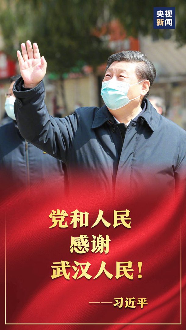 习近平强调,在这场严峻斗争中,武汉人民识大体、顾大局,不畏艰险、顽强不屈,自觉服从疫情防控大局需要,主动投身疫情防控斗争,作出了重大贡献,让全国全世界看到了武汉人民的坚韧不拔、高风亮节。正是因为有了武汉人民的牺牲和奉献,有了武汉人民的坚持和努力,才有了今天疫情防控的积极向好态势。武汉人民用自己的实际行动,展现了中国力量、中国精神,彰显了中华民族同舟共济、守望相助的家国情怀。武汉不愧为英雄的城市,武汉人民不愧为英雄的人民,必将通过打赢这次抗击新冠肺炎疫情斗争再次被载入史册!全党全国各族人民都为你们而感动、而赞叹!党和人民感谢武汉人民!