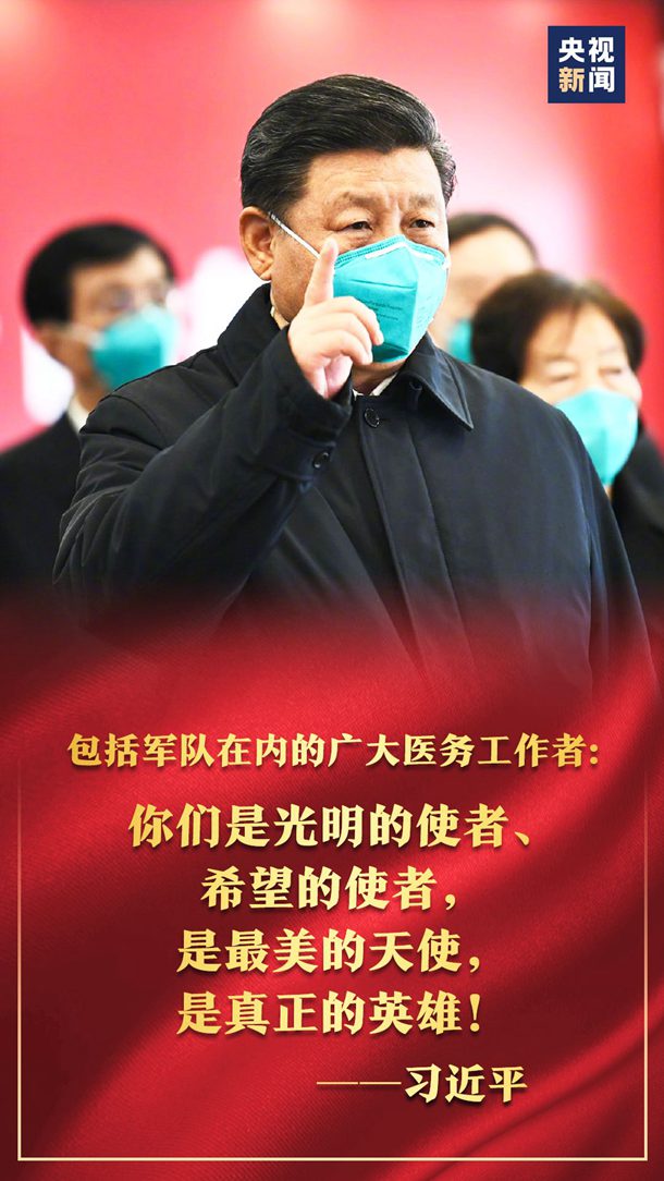 在火神山医院指挥中心,习近平听取医院建设运行、患者收治、医务人员防护保障、科研攻关等情况介绍。习近平指出,疫情发生以来,包括军队在内的广大医务工作者发扬特别能吃苦、特别能战斗的精神,义无反顾奔赴湖北和武汉,毫无畏惧投入防控救治工作,日夜奋战,舍生忘死,不负重托,不辱使命,同时间赛跑,与病魔较量,为武汉疫情防控工作作出了重要贡献。军队医务人员牢记我军宗旨,召之即来,来之能战,战之能胜,为党旗、军旗增添了光彩。沧海横流,方显英雄本色。你们真正做到了救死扶伤、大爱无疆。你们是光明的使者、希望的使者,是最美的天使,是真正的英雄!党和人民感谢你们!