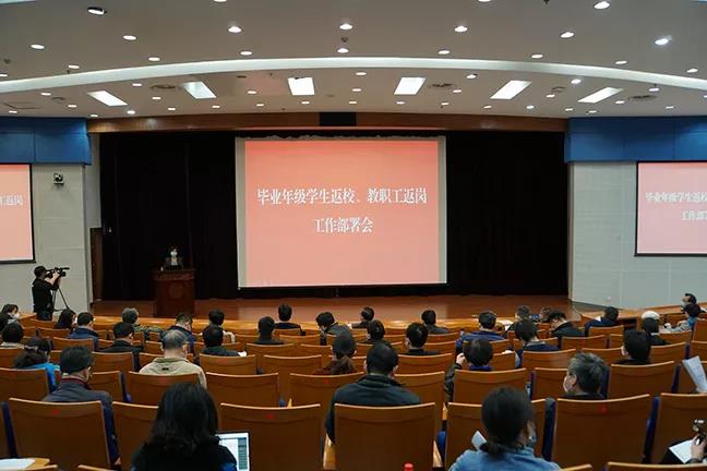 为全面从严从实从细做好返校返岗各项工作,4月22日,学校在八里台校区省身楼报告厅召开毕业年级学生返校、教职工返岗工作部署会。校党委书记杨庆山,校长曹雪涛,校党委副书记杨克欣,副校长李靖,校党委常委于海、梁琪、李君,校长助理曲凯出席会议。会议由杨克欣主持。