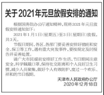 12月18日,天津市人民政府办公厅发布关于2021年元旦放假安排的通知↓↓↓