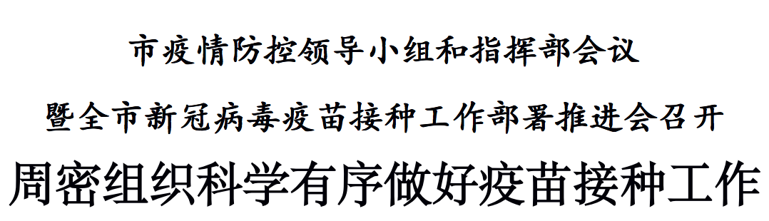 会议对做好我市疫苗接种工作提出要求。一是提高思想认识。充分认识新冠病毒疫苗接种工作的特殊重要性,科学统筹任务进度,积极稳妥、有力有序推进。二是坚持人民至上、生命至上。精准摸底排查,做好接种前后各项工作,有针对性地开展政策解读,耐心细致地答疑解惑,实现应接尽接。综合运用各种媒介,加大对疫苗接种宣传力度。三是坚持科学精准。加强事前演练,科学设置接种流程,精心做好资金、疫苗、人员、场地各方面准备,提升接种能力,强化疫苗保障,做到安全、规范接种。四是强化系统推进。落实“战区制、主官上”要求,各区担起本地区疫苗接种工作主体责任,各部门承担行业责任,主要负责同志担好总指挥、总调度、总督导职责,充分发动基层力量,确保层层压实责任。