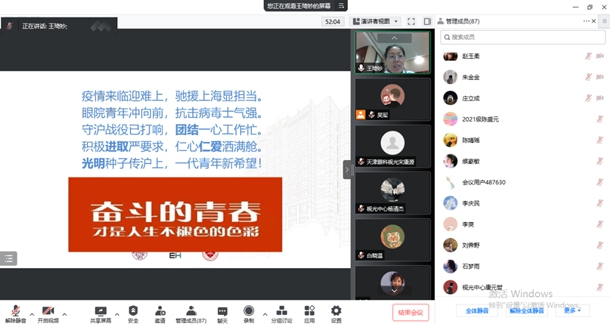 为庆祝中国共青团成立100周年暨第72个“五四”青年节,认真学习贯彻落实习近平总书记考察中国人民大学重要讲话精神,近日,市眼科医院团委联合援沪医疗队临时党支部开展“向援沪医疗队学习”线上交流活动。援沪医疗队队员代表、团员青年、研究生共80余人参加活动。