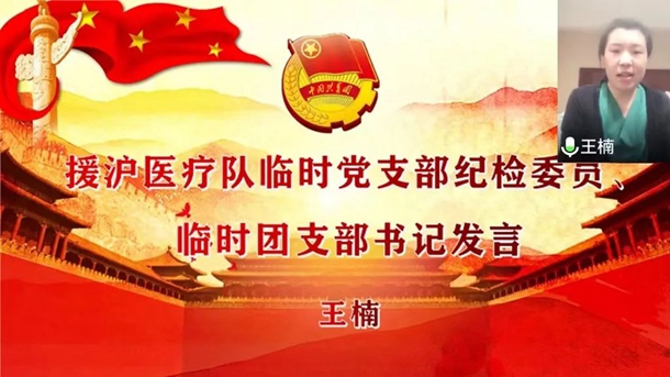 援沪医疗队临时党支部书记王琦妙发言。她详细介绍了医疗队工作、队员思想状态以及团员青年作用发挥等情况。她向参加此次线上交流活动的同事表示感谢,大家对医疗队的关心和支持令队员们倍感温暖,医疗队必将凝心聚力、攻坚克难,坚决打赢上海疫情防控阻击战这场大仗硬仗,早日与大家团聚。