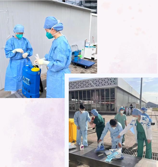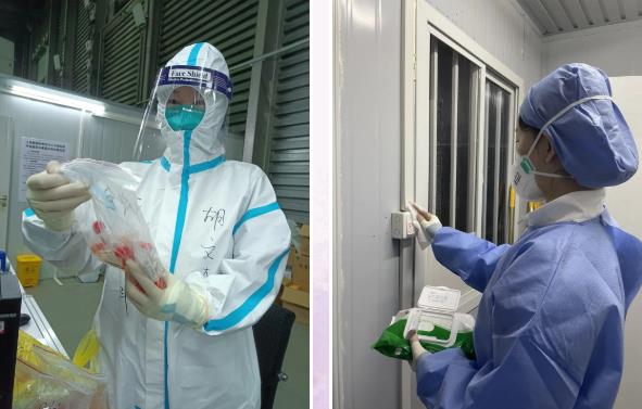 进舱前,我要负责指导并监督所有队员防护用品的穿脱。督促做好手卫生,按照标准流程穿戴防护用品,穿戴好的小伙伴,必须一个个经过我的认真检查,从口罩的气密性,面屏的高低、到防护服的完整密封性,再看脚套和手套与防护服的衔接,每一个细节都必须不折不扣的达到标准要求,才能让他们进入舱内工作。虽然累,但看着每个人都能在防护完全的情况下进舱,我觉得很安心。有医护在的地方,必然会有院感防控的保障。