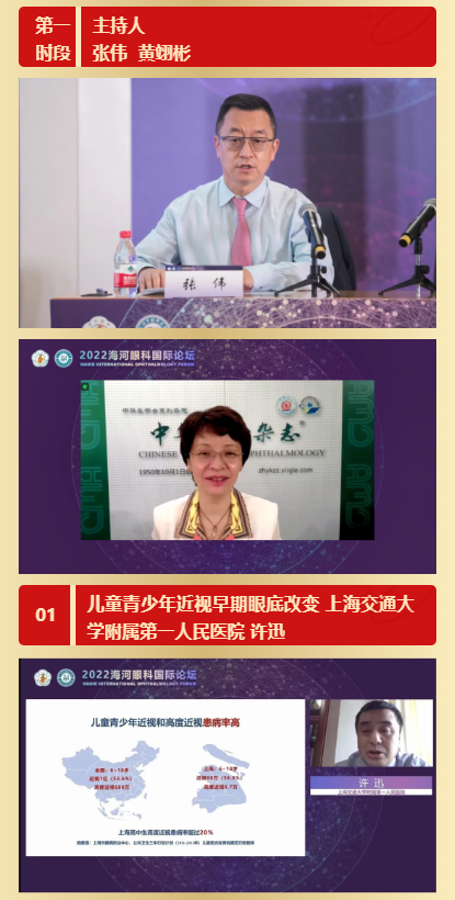 在第一时段上海交通大学附属第一人民医院许迅教授详细介绍了近视眼轴增长对眼部病变的关系,山东省眼科医院史伟云教授为大家带来了角膜皮样瘤的诊断、手术方式的选择以及典型病例的介绍,首都医科大学附属北京同仁医院魏文斌教授就人工智能在近视防控领域的应用示范进行了详尽的讲解,中国人民解放军总医院李朝辉教授对关于白内障患者人工晶体公式的选择做了详细的介绍,来自中华医学会杂志社黄翊彬教授为大家介绍了医学研究及论文发表时应注意的伦理学问题,中国医学科学院北京协和医院陈有信教授对病理性近视导致的不同眼底病变的AI识别方法的前沿研究进行了介绍,上海交通大学医学院附属新华医院赵培泉教授列举了典型重水残留的病例并对其预防与处理方法进行了汇报,天津市眼科医院张伟教授为纪念赫雨时教授开创和发展我国斜视事业,给大家带来赫雨时教授纪念专题讲座以及斜视相关的神经眼科学问题。