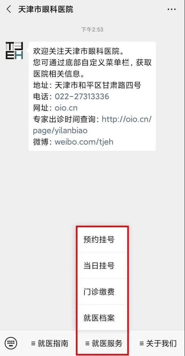 (2)天津市眼科医院公众号。您可从公众号下方自定义菜单栏预约挂号。