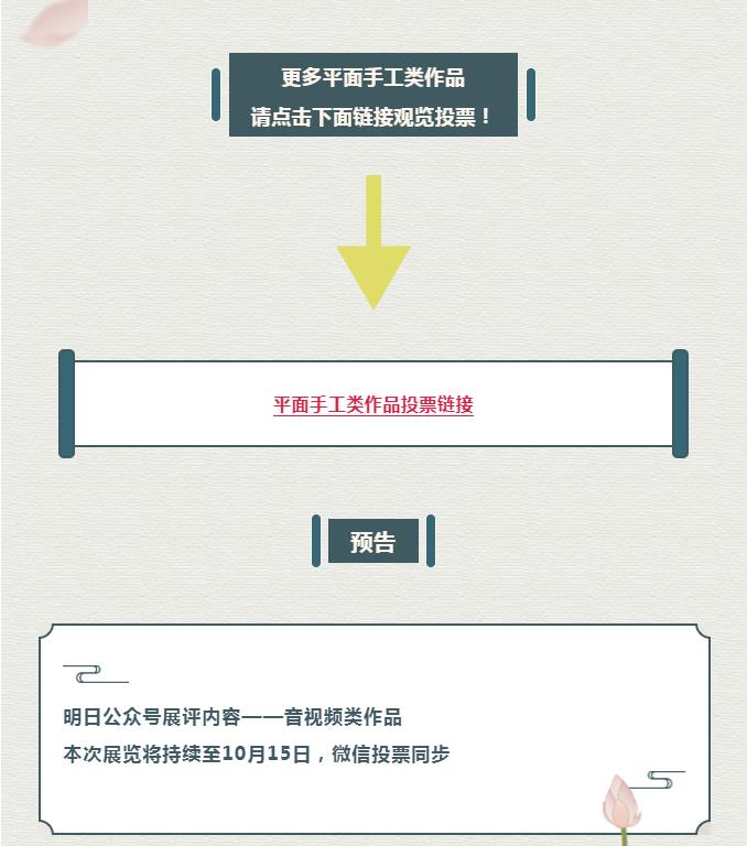 9月29日起,“线上+线下”观览线路同步开通。大家可以来到四楼圆厅进行现场参观投票;也可以登录医院微信公众号参与“云上”观览投票,公众号将连续3天发布3期专题作品展信息。欢迎大家积极转发,邀请亲朋好友走进廉洁文化长廊,共赏共投您心目中的优秀作品!