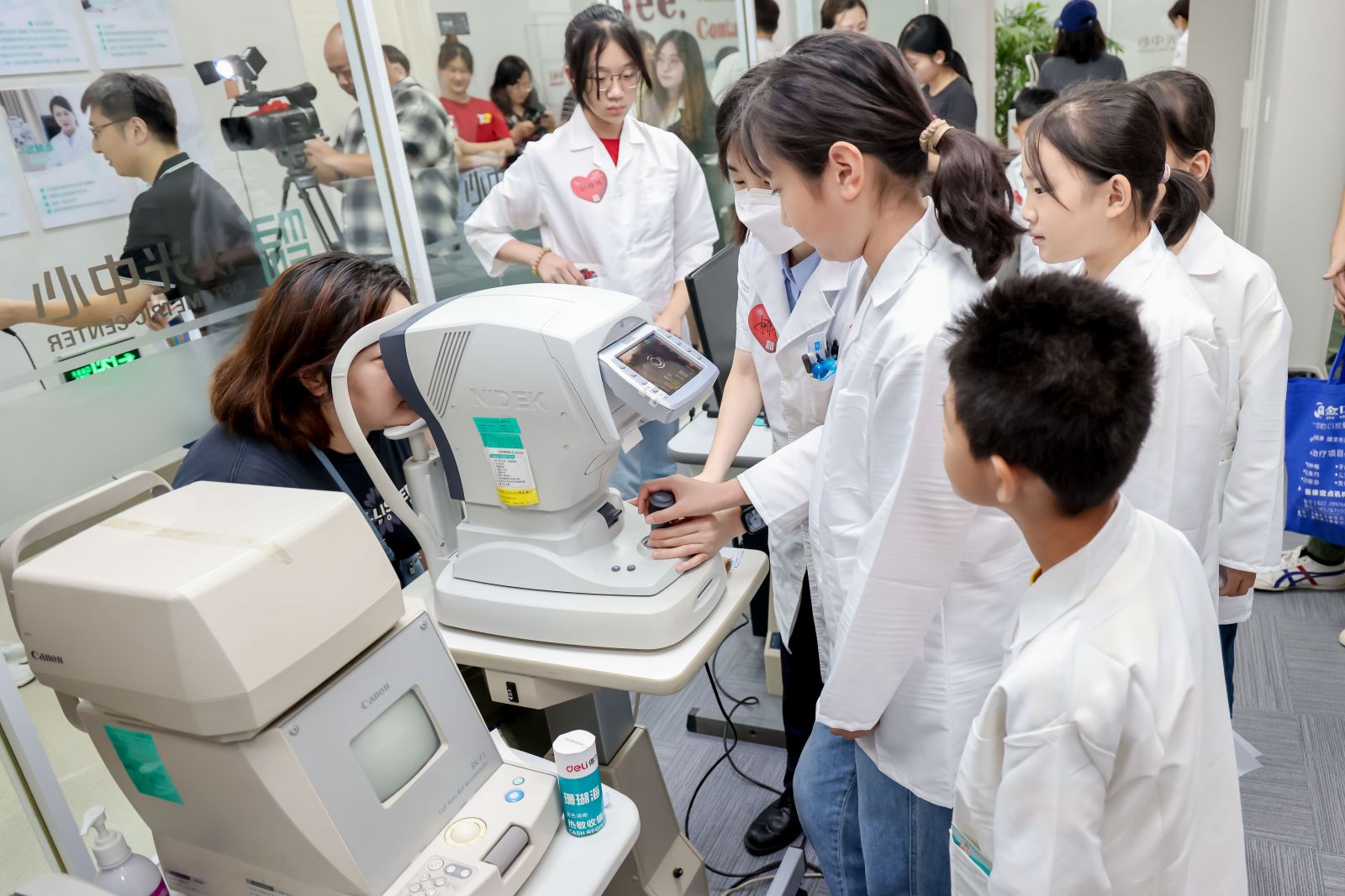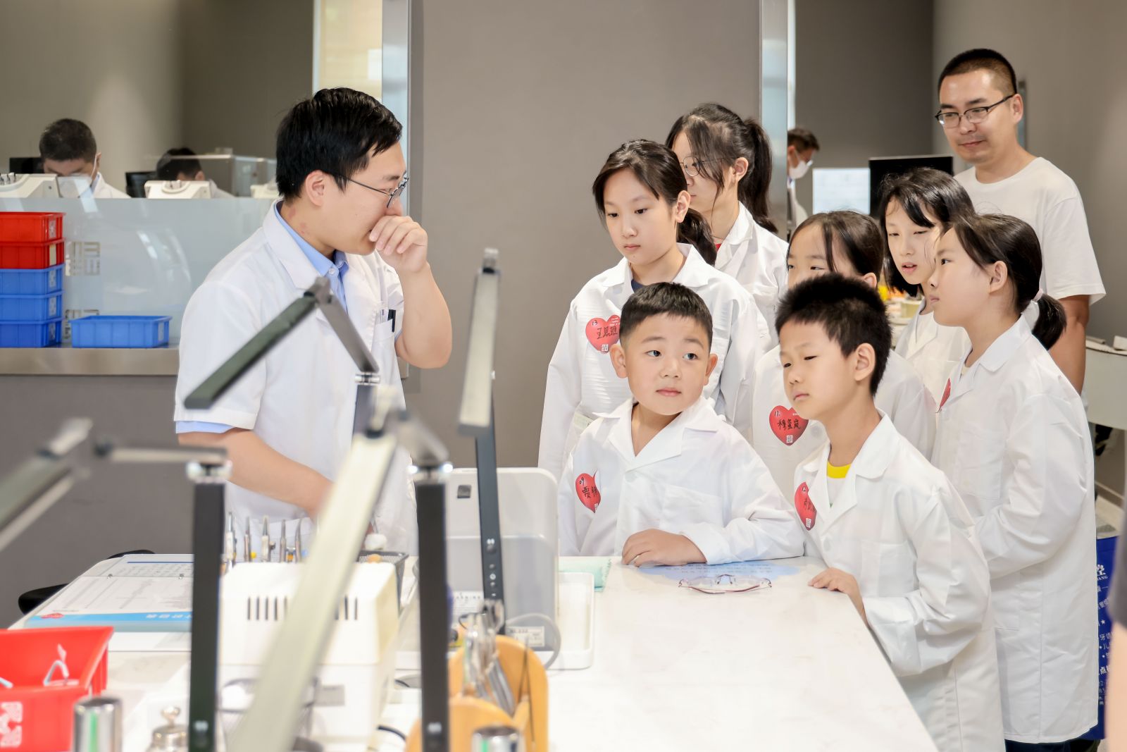 23名小朋友身穿白大衣,化身小小视光师,在现场工作人员的带领下开启了一场神奇的眼健康之旅。通过视光科普小讲堂、爱眼互动小游戏、眼健康检查、镜片个性化印刻、绘制画卷等精心设计的有趣活动,鼓励孩子们积极学习、勇于实践,成为一名“视光小行家”,将爱眼护眼的眼健康知识和理念带给更多的家庭。