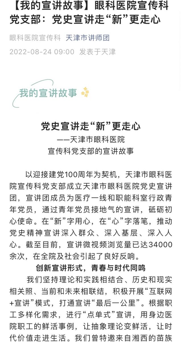 以“小切点”引发“大思考”、以“小故事”阐述“大理论”,《党史宣讲走“新”更走心——天津市眼科医院宣传科党支部的宣讲故事》在“学习强国”、“天津市讲师团”微信公众平台转载。