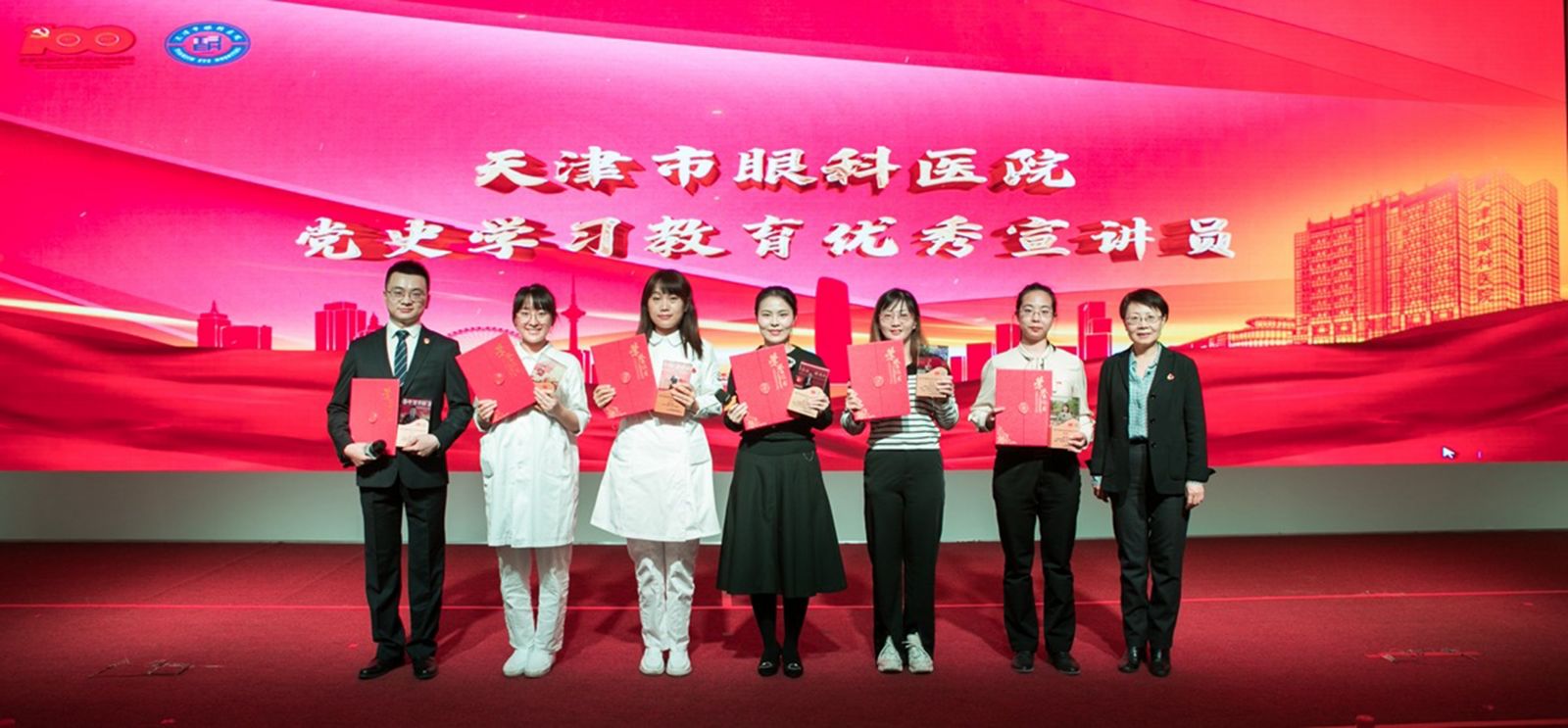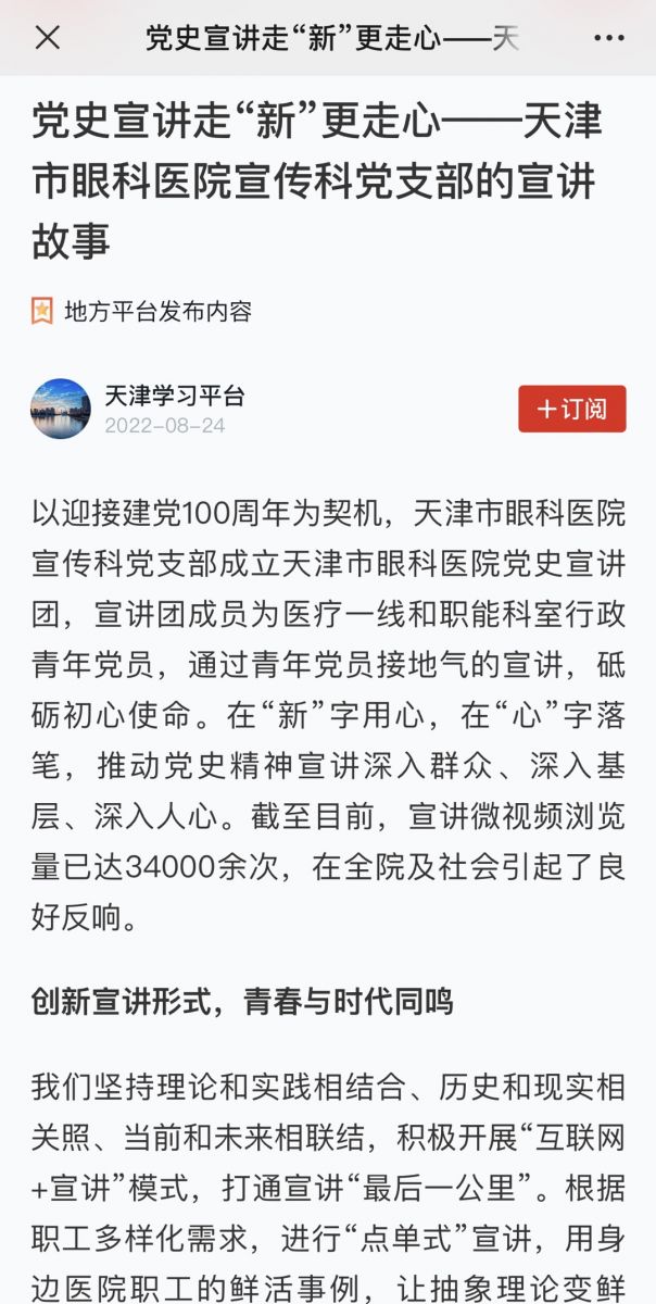 以迎接建党100周年为契机,天津市眼科医院成立天津市眼科医院党史宣讲团,宣讲团成员为医疗一线和职能科室行政青年党员,契合广大群众对热点形势政策的关切,医院领导干部带头宣讲,同时特邀先进青年、劳模人物、少数民族党员、优秀干部作为宣讲员,把党的创新理论宣讲与天津卫生事业发展实践相结合。医院结合党史学习教育、党的二十大精神、学习贯彻习近平新时代中国特色社会主义思想主题教育等时政热点,在“新”字用心,在“心”字落笔,推动理论宣讲深入群众、深入基层、深入人心。截至目前,宣讲微视频已录制二十一期,浏览量达37000余次,在全院及社会引起了良好反响。在市委宣传部联合津云新媒体组织开展的“理响新征程 ·礼赞新时代”天津市基层理论宣讲员大赛中,宣讲作品《推动公立医院高质量发展 书写人民健康崭新篇章》代表卫生系统内优秀作品进入复赛。
