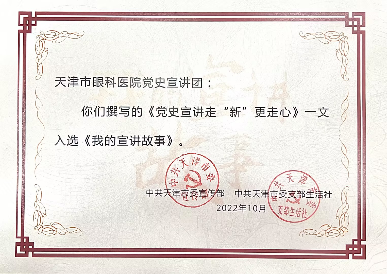 为深入学习贯彻习近平新时代中国特色社会主义思想,巩固拓展党史学习教育成果,强化基层理论宣讲队伍建设,中共天津市委宣传部和中共天津市委支部生活社联合开展“我的宣讲故事”主题征文活动。天津市眼科医院作为天津市卫生健康委唯一一家入选单位,文章《党史宣讲走“新”更走心——天津市眼科医院党史宣讲团》刊登在《我的宣讲故事》文集“优秀集体”章节。
