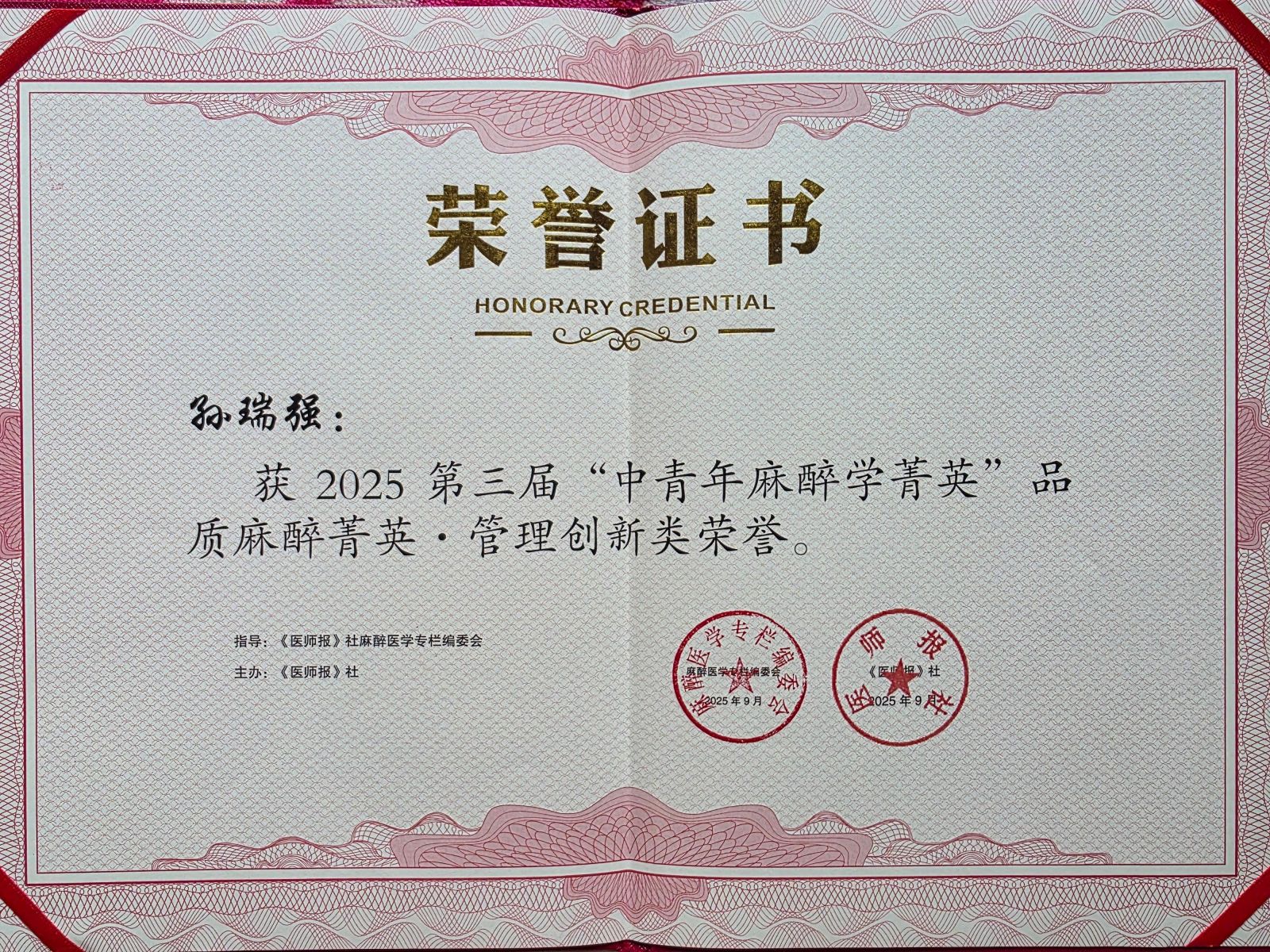 医院荣誉丨天津市眼科医院孙瑞强主任获第三届《医师报》“中青年麻醉菁英”比赛“品质麻醉菁英·管理创新类”荣誉