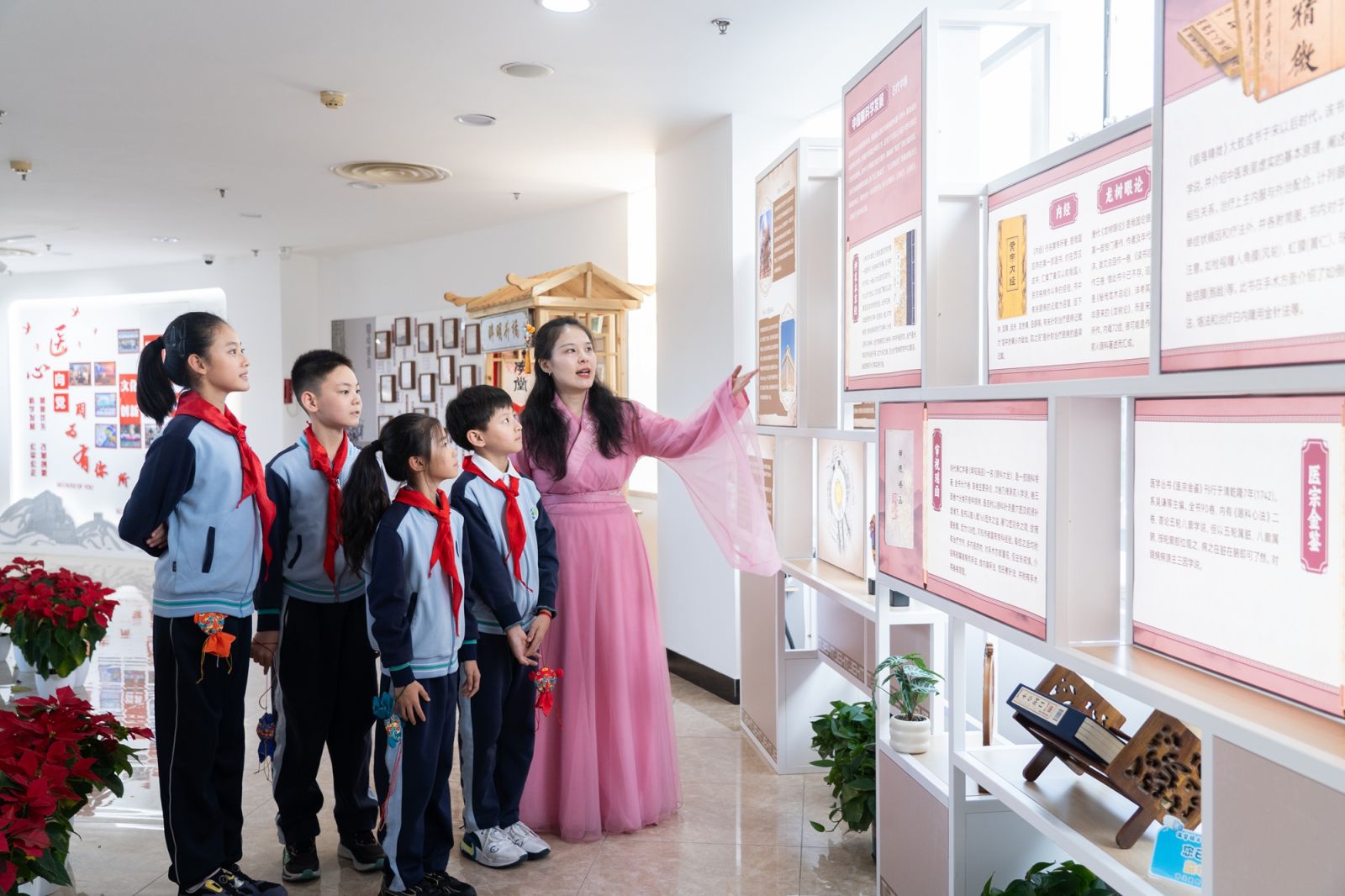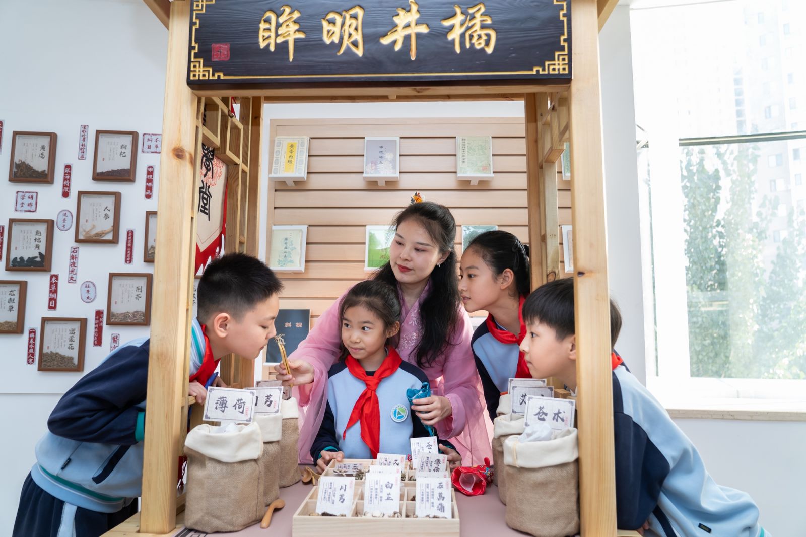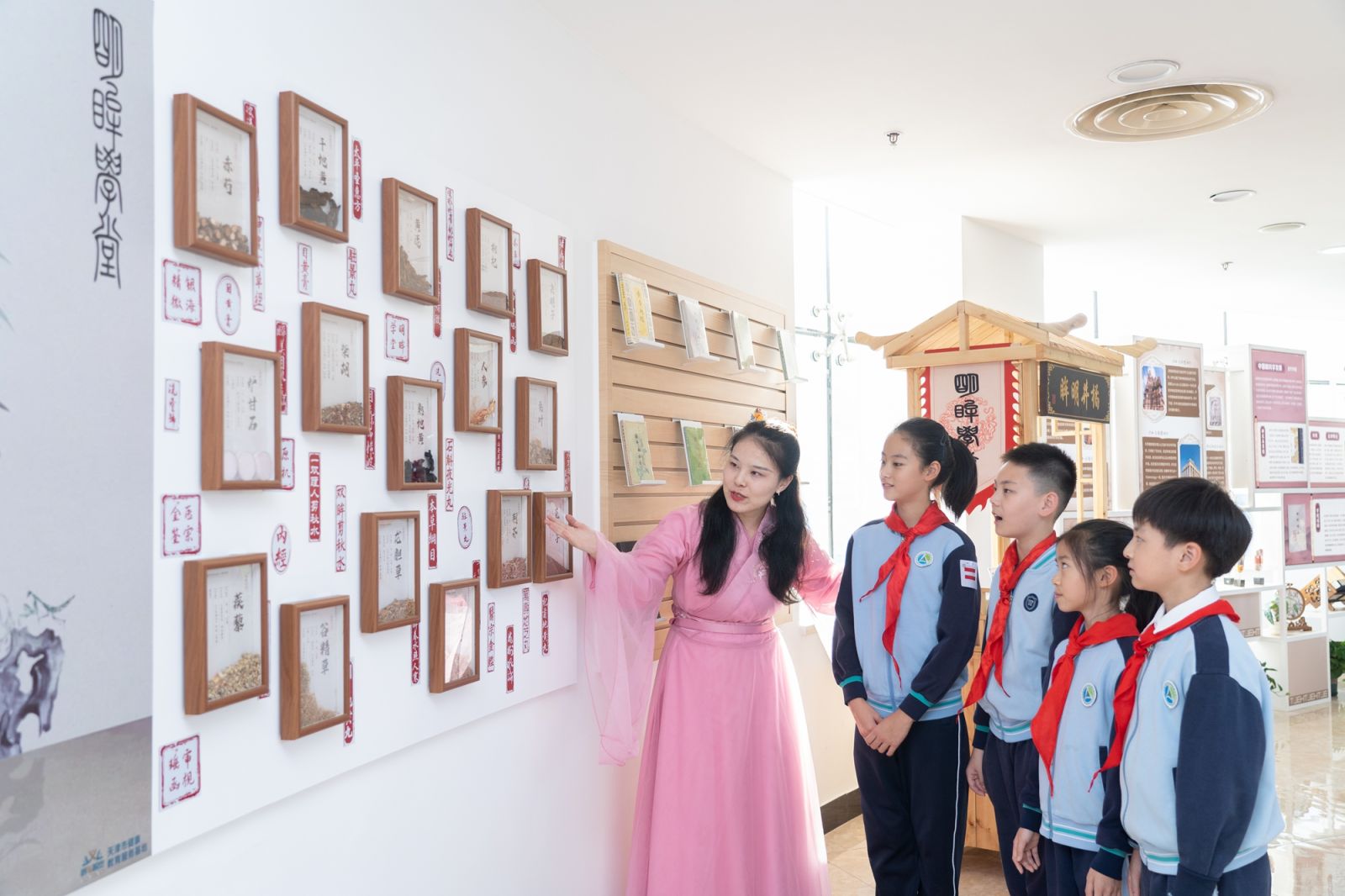 在“橘井明眸”中医体验馆,基地讲解员向孩子们普及经典医籍、传世名方、道地药材等中医药传统文化,同时在亲手制作明目醒脑香囊的过程中感受中国优秀传统文化的魅力。