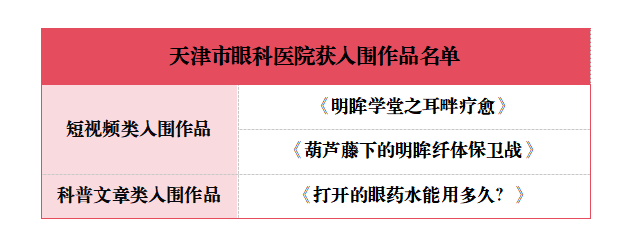 荣誉,化为动力;肯定,赋予担当。天津市眼科医院将坚持以人民健康为中心,持续提升科普作品原创能力,做科学、权威、实用、通俗易懂的科普,推动“人人是自己健康第一责任人”的健康理念的形成,守护好每一双明亮的眼睛。