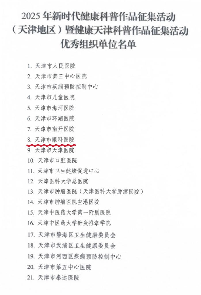天津市眼科医院在2025年新时代健康科普作品征集活动(天津地区)暨健康天津科普作品征集活动中获佳绩