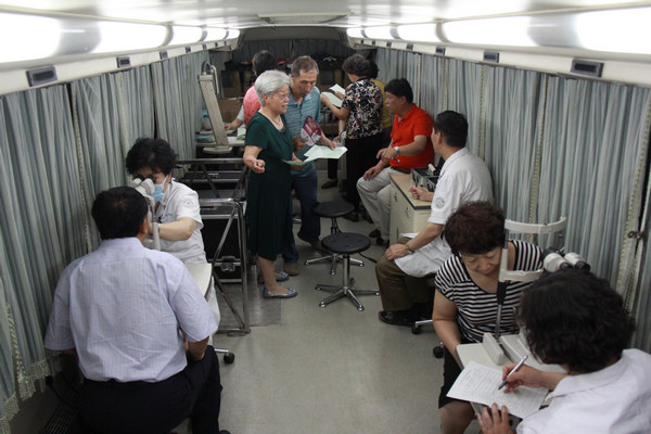 2013年6月28日我院直通车成员在完成白天的义诊咨询服务后,不顾疲劳晚上又在山西省临汾市国税宾馆为老促会、九三学社老干部及其家属义诊。图二、三为直通车内部检查。
