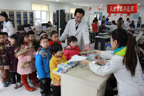 2014.3.12世界青光眼周,天津市眼科医院社区服务直通车来到劝业场街新津里社区为当地居民义诊102人,并发放眼科科普知识宣传材料500余份。