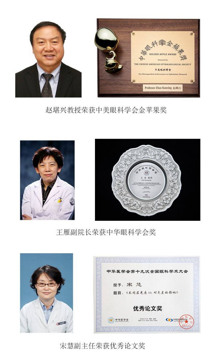 鉴于赵堪兴教授对中国眼科教育事业所作出的杰出贡献,中美眼科学会授予其“2014年度金苹果奖”;因在眼科临床、科研和教学中所取得的优异成绩,感谢其多年来对眼科学会所做出的卓有成效的工作和大力支持,特授予王雁教授等18人“中华眼科学会奖”。