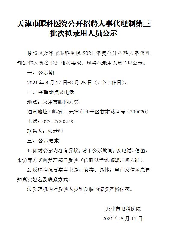 天津市眼科医院公开招聘人事代理制第三批次拟录用人员公示