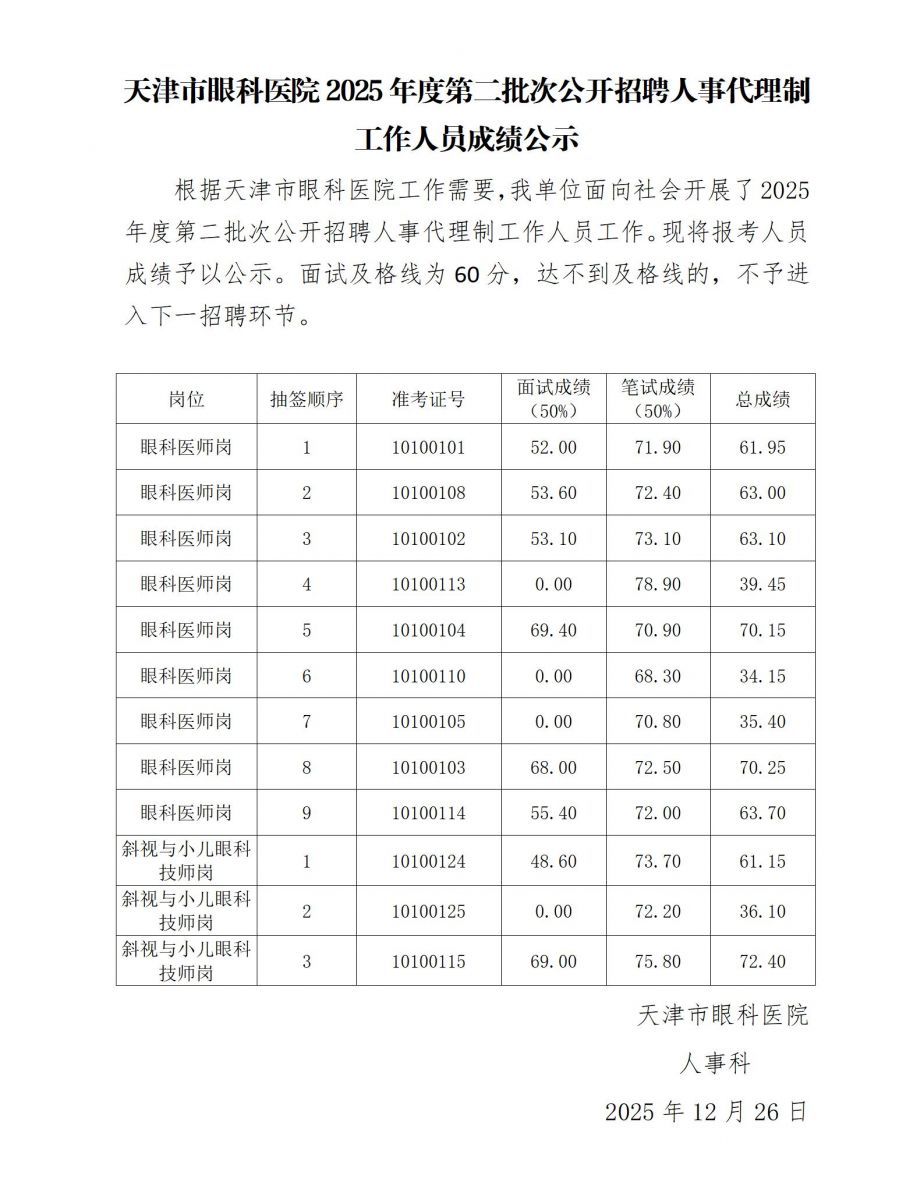 天津市眼科医院2025年度第二批次公开招聘人事代理制工作人员成绩公示